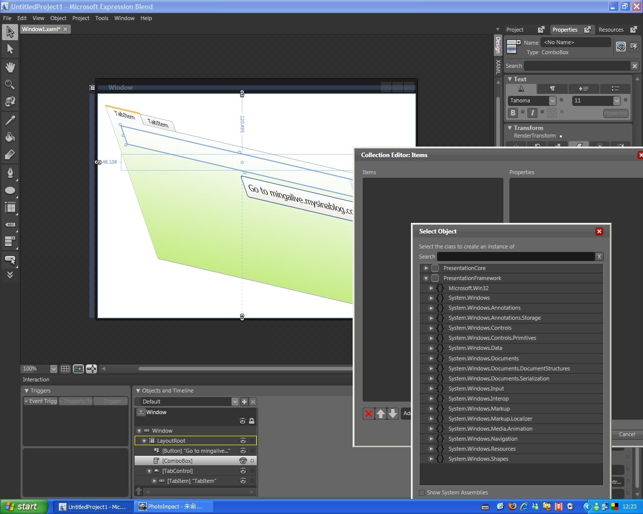 我嘗試放下一個ListBox,想如VS2005般在Porperty加入Item時,出了一個不明的視窗.原來在Blend中,已經不可以好像VS2005般加入Item. 無論是ListItem,Gridview中的Header,Column,Row項目,Blend都把他們分開,需要在Control Box中拉至Design View並放入如Gridview,Listbox的Control中. (見下圖)